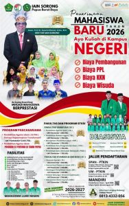 Humas IAIN Sorong – Institut Agama Islam Negeri (IAIN) Sorong resmi membuka Penerimaan Mahasiswa Baru (PMB) Tahun Akademik 2026–2027. Di bawah kepemimpinan Rektor Assoc. Prof. Dr. Suparto Iribaram, S.Sos., M.A, IAIN Sorong mengundang putra-putri terbaik bangsa, khususnya dari Papua Barat Daya dan seluruh Indonesia, untuk bergabung di kampus negeri yang berkomitmen mencetak generasi unggul dan berprestasi.