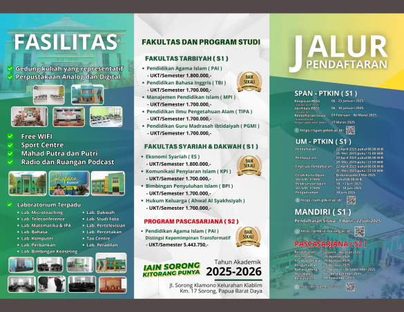 PMB Jalur SPAN PTKIN (Seleksi Prestasi Akademik Nasional Perguruan Tinggi Keagamaan Islam Negeri) 2025 diharapkan menjadi wadah yang efektif untuk menjaring calon mahasiswa yang memiliki prestasi akademik unggul dan memiliki minat untuk melanjutkan studi di Perguruan Tinggi Keagamaan Islam Negeri (PTKIN), termasuk di IAIN Sorong. Jalur ini memberikan kesempatan kepada siswa yang berprestasi di bidang akademik untuk masuk ke PTKIN tanpa melalui ujian tertulis, melainkan berdasarkan prestasi yang tercatat selama di sekolah menengah.