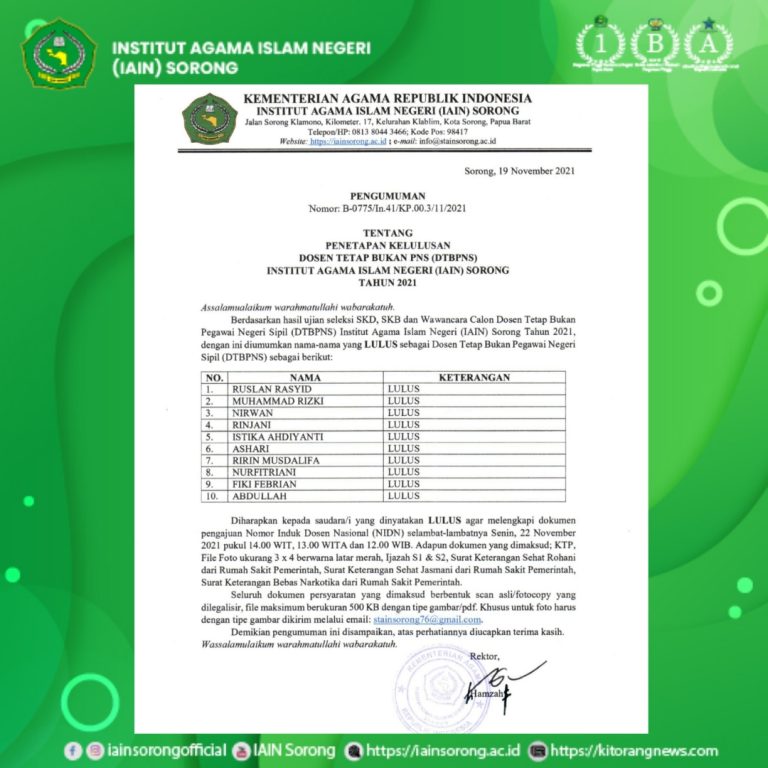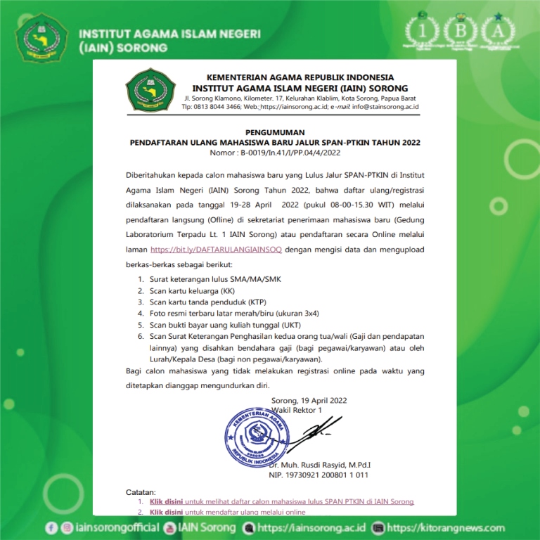 Assalamulaikum wr wb. Sebagai wujud upaya Quality Control kemampuan berbahasa asing Dosen/Tenaga Kependidikan/Mahasiswa IAIN Sorong, Unit Pengembangan Bahasa IAIN Sorong melaksanakan Tes TOEFL Institusional setiap bulannya (gratis). Sertifikat dapat dipergunakan sebagai syarat Yudisium/Serdos/lamaran kerja Swasta Silahkan daftarkan diri Anda…