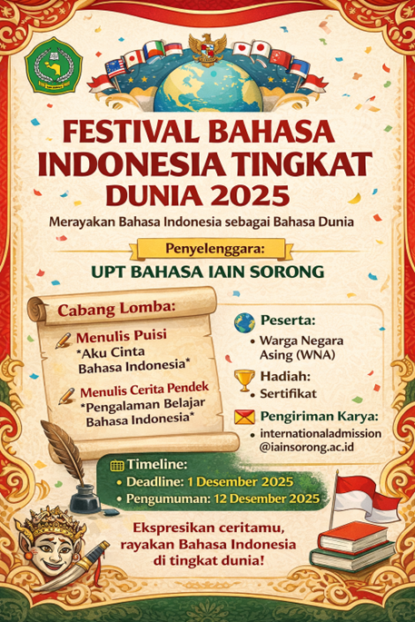 UPT Bahasa IAIN Sorong akan menyelenggarakan Festival Bahasa Indonesia Tingkat Dunia 2025 sebagai bagian dari upaya berkelanjutan dalam mempromosikan Bahasa Indonesia kepada masyarakat internasional. Kegiatan ini akan menjadi wadah apresiasi…